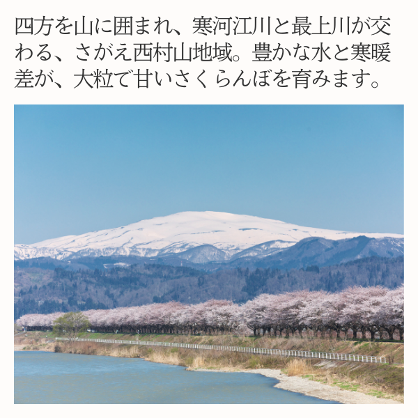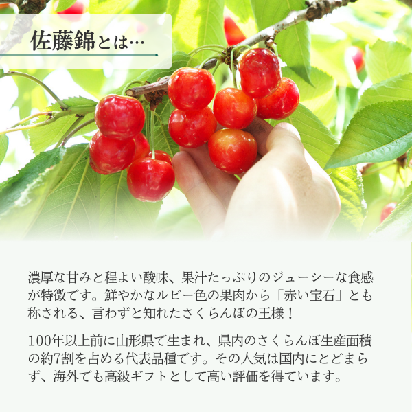 この度は、JAさがえ西村山公式オンラインショップをご利用いただき、誠にありがとうございます。 ひとつひとつ丁寧に手詰めした高級感あふれる当店のさくらんぼは贈答用にもぴったりでございます。 ぜひ来年もお客様と大切な方に当店のさくらんぼをご賞味いただけますと幸いです。 この度は当店のご利用誠にありがとうございました。 またのご利用をスタッフ一同、心よりお待ちしております。