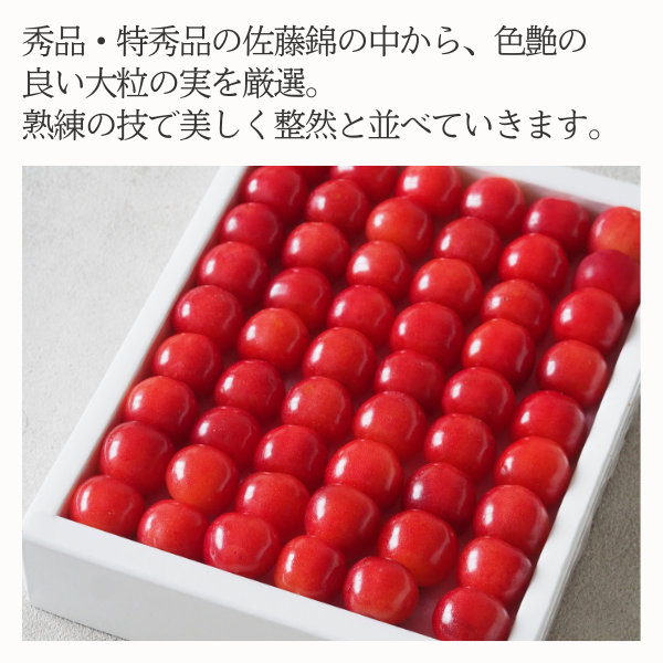 この度は、JAさがえ西村山公式オンラインショップをご利用いただき、誠にありがとうございます。 佐藤錦の特徴である、上品な甘みをご堪能いただけましたこと非常に光栄でございます。 ひとつひとつ丁寧に手詰めされた当店のさくらんぼにご満足いただけたようでスタッフ一同非常に嬉しい限りです。 当店では様々なタイプのさくらんぼを販売しておりますので、さくらんぼシーズンにぜひ他の商品もご賞味いただけますと幸いです。 改めまして、この度は当店のご利用誠にありがとうございました。 またのご利用をスタッフ一同、心よりお待ちしております。