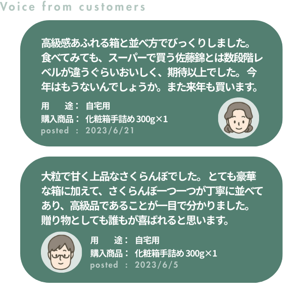 この度は、JAさがえ西村山公式オンラインショップをご利用いただき、誠にありがとうございます。 当店のさくらんぼは、熟練の技術から、見栄え・美味しさ・食べ応え抜群の最高品質のさくらんぼをお客様のもとへお届け致しております。 その特徴である、見た目とおいしさ、ジューシーさにご満足いただけましたこと、非常に嬉しい限りでございます。 当店のさくらんぼは様々なタイプの商品を販売しており、贈答用としても非常に人気の商品でございます。 ぜひこのさくらんぼシーズンの機会に他の商品もご覧いただけますと幸いです! 改めまして、この度は当店のご利用誠にありがとうございました。 またのご利用をスタッフ一同、心よりお待ちしております。