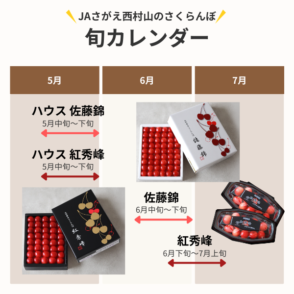この度は、JAさがえ西村山公式オンラインショップをご利用いただき、誠にありがとうございます。 ひとつひとつ丁寧に手詰めされた当店のさくらんぼに味も見た目もご満足いただけたようで嬉しい限りです。 大変申し訳ございませんが、今年のさくらんぼの販売は終了しております。 これからも美味しいさくらんぼ作りに努めて参りますので、また来年もご購入いただけますと幸いです。 この度は当店のご利用誠にありがとうございました。 またのご利用をスタッフ一同、心よりお待ちしております。